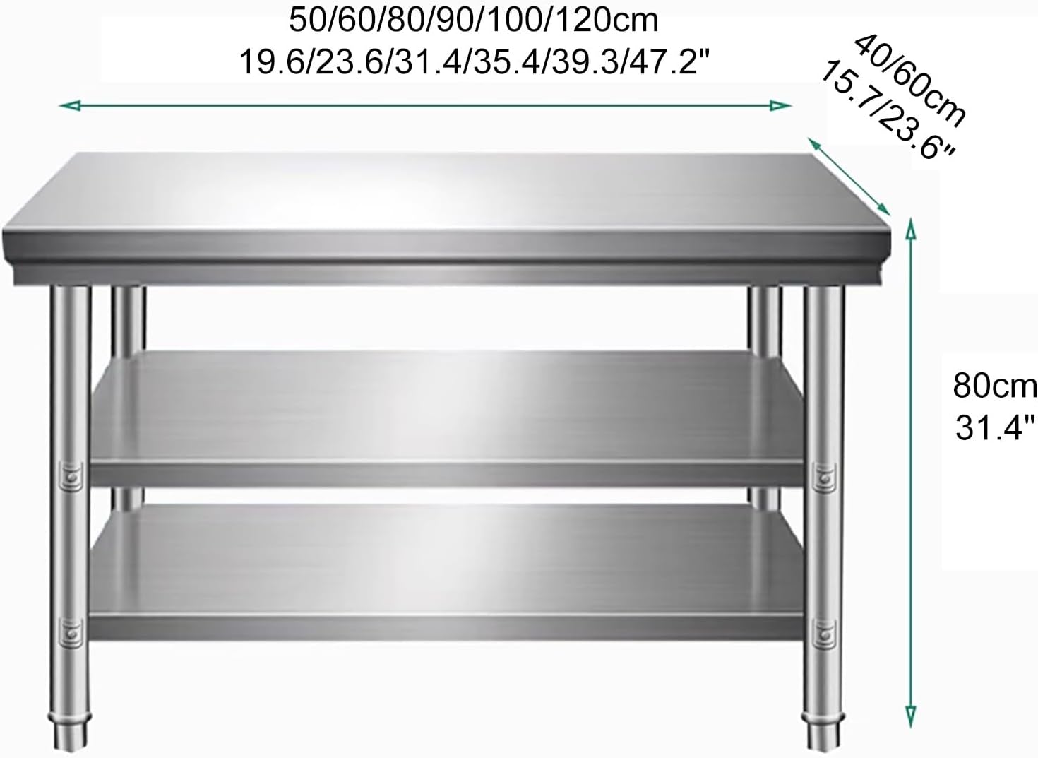 ——Our commercial kitchen food preparation countertops are made of high-quality 201 stainless steel, making them ideal for storing tools and working at home or in the office——Using a unique triangular structure design, the countertop is specially supported by density board to ensure that it is not easy to shake or tilt during use——The countertop is made of one-piece molding technology, with a smooth surface and no seams. The folded edge of the desktop not only improves the overall load-bearing capacity, but also the smooth and corner-free design is easy to clean and maintain——The workbench is equipped with a threaded adjustable foot design, which allows users to easily adjust the height of the workbench to adapt to the unevenness of different floors——The workbench is connected with all-metal hexagonal screws. The all-metal material is not easy to wear and tear, which extends the service life of the workbench【Parameter Information】Name: Stainless Steel WorkbenchMaterial: 201 Stainless SteelNumber of Layers: 3 LayersSurface Process: BrushedAdditional Function; Adjustable Bottom FeetSize: Refer to the size optionsInstallation Method: AssemblyNote: There is no horizontal support under the tabletop below 1 meter (39.3in), which is convenient for placing columns!
