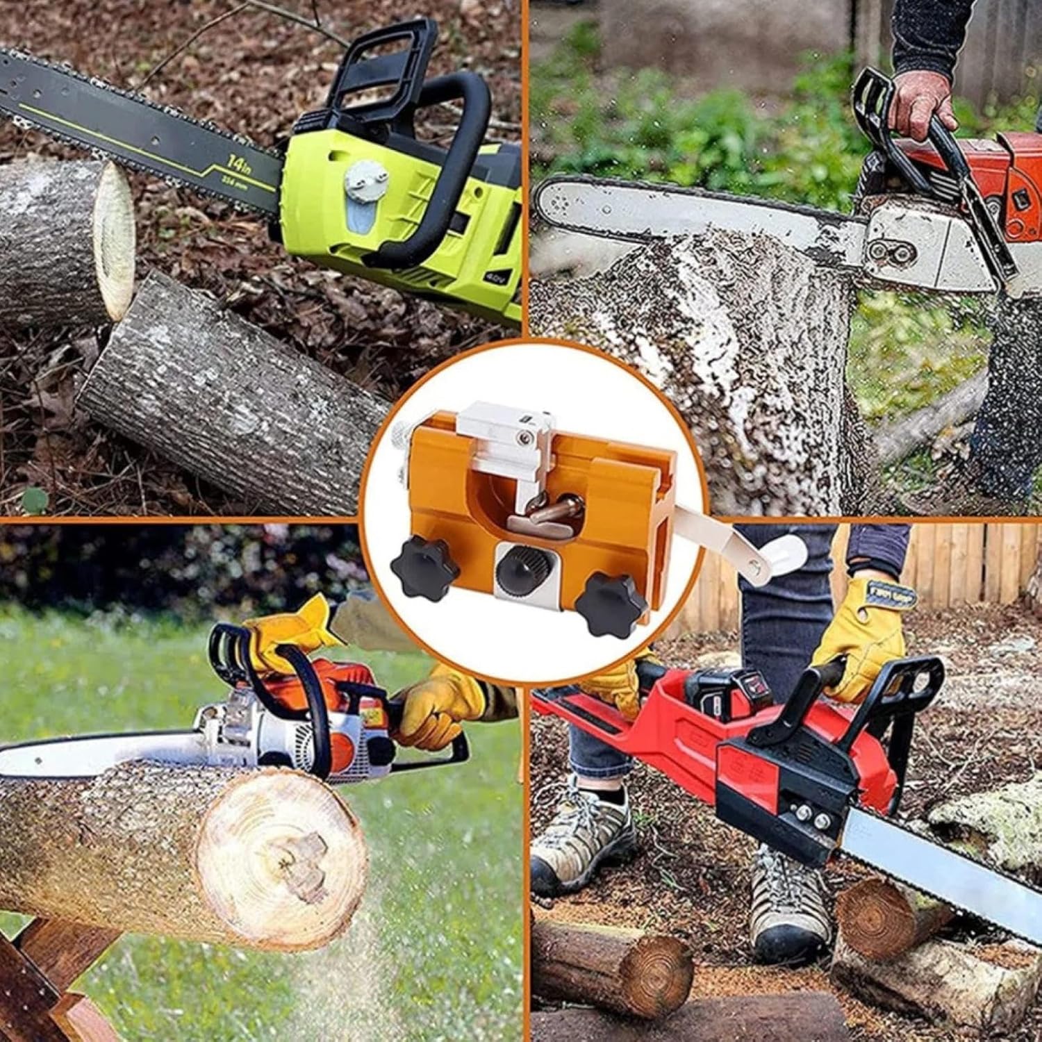 ★ Use the hand-crank chain saw chain grinding fixture to make your chain saw as sharp as new, making your work more time-saving and labor-saving and fun. this product is easy to carry because the product is with compact size and lightweight body. compatible with all kinds of chain saws and electric saws, also perfect for lumberjack and garden worker. ◆ Description:Material: aluminum alloySize: 98.09*65.32*75.06mmPower: manualColor: OrangePower source: hand crank◆ Contains content:1 x Chain saw sharpener3 x Grinding head1 x Fixture◆ How to use:Just fix the chainsaw sharpener on the saw, position the pawl on the tooth, insert the burr into the guide sleeve, and then turn the handle like a pencil sharpener. change gear after grinding, every time you grind a tooth, you only need to pull the chain. the precise sharpening can ensure that every tooth is repaired.◆ Notice:1. Due to manual measurement, please allow a slight error.2. The color may be slightly different due to different monitors.