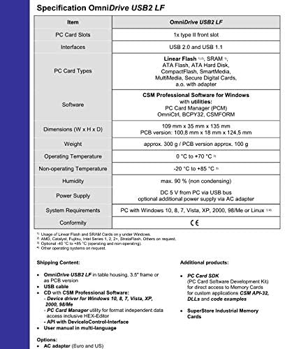 OMNIDriveUSB LF is an external PC Card drive for Linear Flash, SRAM, ATA Flash Cards, ATA Hard Disks, with PCMCIA card adapter for SmartMedia Cards, CompactFlash Cards, Multimedia Cards, and SD Cards. MNIDriveUSB LF is designed to handle Linear Flash, SRAM PC Cards as well as ATA memory media. Our own device drivers guarantee trouble-free and reliable operation under even under Windows 2000 and XP/VISTA. Included is also our powerful PC Card Manager software utility which allows for: * Flexible DOS Format Utility * Hex Editor and Binary Data Copy Utility * Inspect and Repair Tool for ATA media
