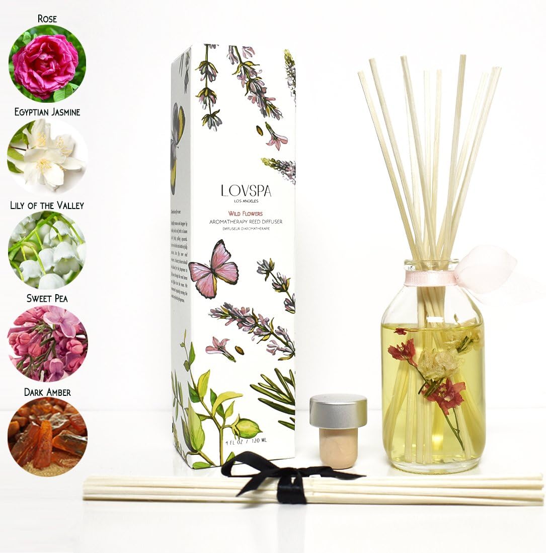 LOVSPA Wild Flowers Reed Diffuser Refill, 4 oz, Bundle with Wild Flowers Reed Diffuser Set – Wild Flowers fragrance notes: Rose, Egyptian Jasmine, Sweet Pea, Lily of the Valley & Dark Amber. A soft, creamy floral home fragrance. A pretty diffuser set that can fill a room with worry-free fragrance. LOVSPA Reed Diffusers emit a subtle, yet long-lasting scent — it's the perfect choice for your home fragrance & home decor needs. Gorgeous packaging is the perfect complement to our beautiful bottles filled with real spices, fruit and botanicals. Concentrated and highly effective, our diffusers do not contain alcohol. Each set comes with concentrated fragrance & a set of diffuser reeds. Reed diffusers will emit long-lasting fragrance; much longer than a candle and, with no flames, they are more practical. Paraben, sulfate, phthalate and phosphate free. Vegan. Never tested on animals. LOVSPA Fragrances Reed Diffusers are beautifully gift boxed, making them a perfect gift idea for any occasion; Great for a Birthday or Christmas. The elegant LOVSPA Fragrances Collection of Reed Diffusers will transform your home into a fragrant spa retreat. Using the science of aromatherapy, our scents are expertly blended to soothe, uplift or restore. Stunningly styled, pleasing to the eye and with fabulous fragrances to choose from, there is no doubt that our creations make a positive addition to any home. We at LOVSPA Fragrances understand that home fragrance is a very personal choice with an enormous power to enhance the home and we thank you for your support of our small business. Be sure to check out our Storefront for more revolutionary home fragrance and spa products! LOVSPA Fragrances Give any space a luxurious ambiance and love the air you breathe.