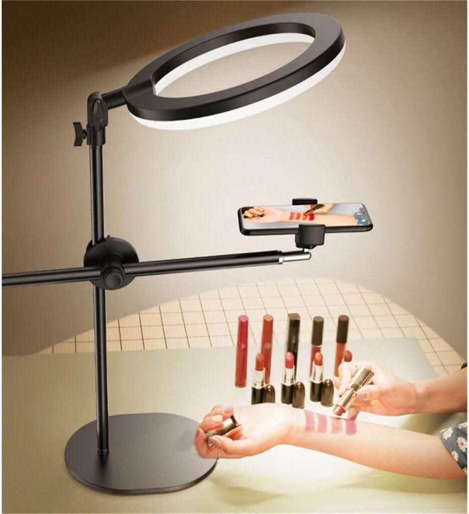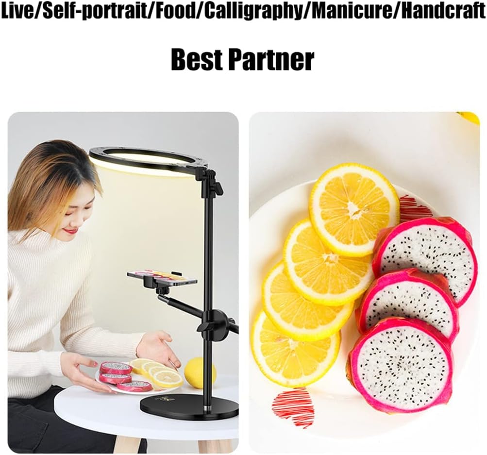 Features:Large range of light filling, sufficient brightness, no shadow, good stability, uniform and soft light.Three kinds of light effects: warm light, cold and warm light, and cold light to meet different needs.The fill light can be adjusted by 360 °+180 °, the mobile phone bracket can be adjusted by 360 °, and the mobile phone lever can be adjusted by 360 ° to meet various needs.The whole fuselage is made of carbon steel, and the base is reinforced to make shooting more stable.About 3cm thick non slip foam protects the table top.standard:: Desktop overhead floodlight bracket setMaterial: carbon steel+ABSLight source: warm light, warm light, cold lightPower mode: chargingApplicable mobile phone width: 6.5-10cm (screen ≤ 6 )Size of fill light: 26cm/10 Height: 50 cm/19.7 Color: blackPacking list: 1 set x fill lightNote :1. Due To The Light And Screen Difference, The Item's Color May Be Slightly Different From The Pictures.2. Please Allow Error Of A Few Centimeters Differences Due To Manual Measurement.Due to manual measurement, please allow for a difference of 1-3 centimeters. Thank you for your understanding