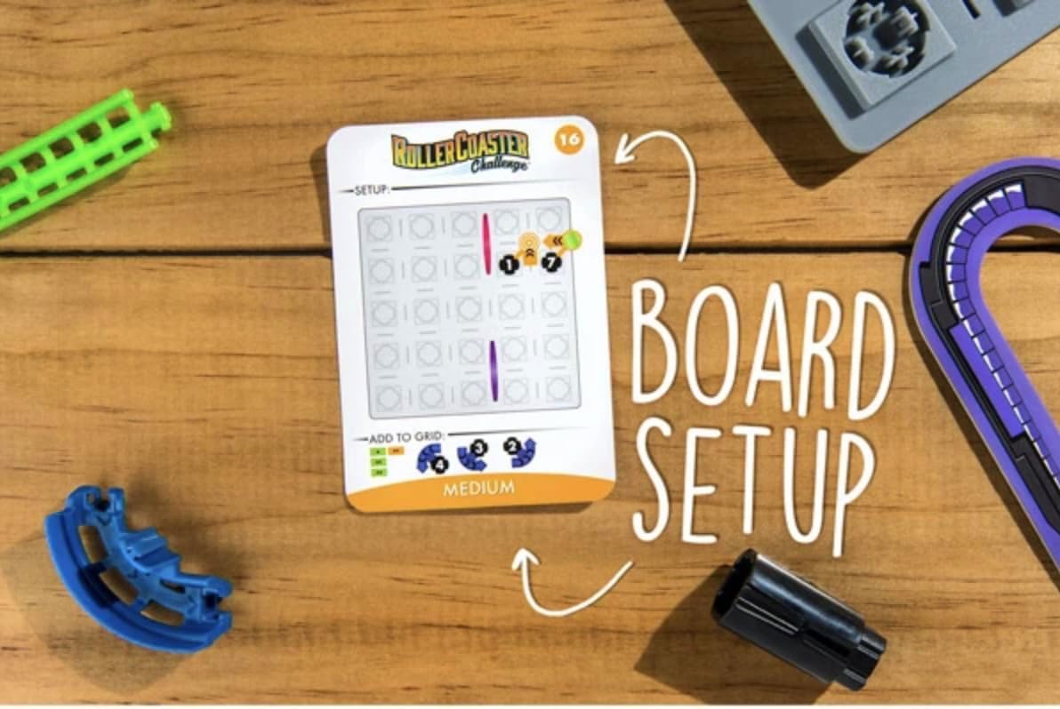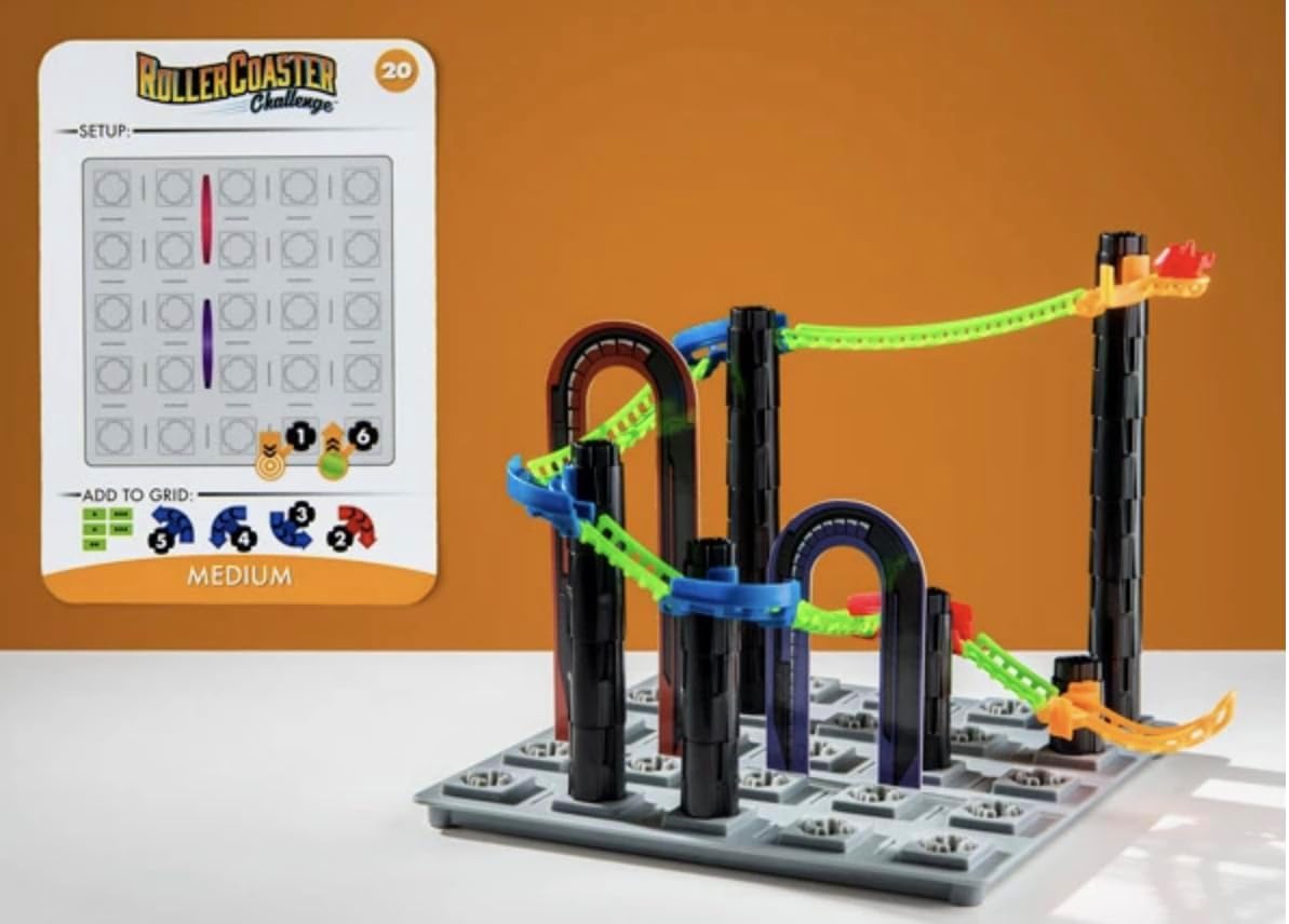 Your goal in this thinking game is to use the track pieces prescribed on the challenge card to create a functioning roller coaster that can get the car to safely glide to the end of the track. In addition to figuring out how to turn and loop-the-loop your coaster to its destination, you'll need to plan the right heights to get your pretend passengers there using only gravity. Roller coaster themed logic puzzle Solve a challenge in 3D by assembling the pieces 1 player game 4 levels of difficulty Includes: game grid, 1 roller coaster car, 39 track pieces, 36 post pieces, 2 tunnels, 40 challenges with solutions, and instructions
