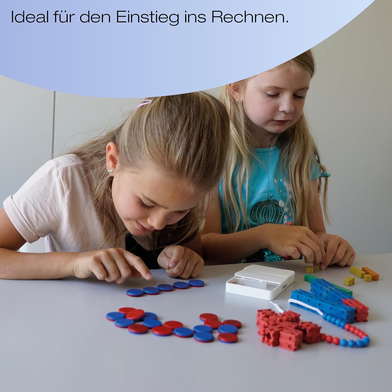 Math basic set Plus ZR 20 - everything students need to calculate in the number space up to 20 - 1 calculator chain for 20 number space - 1 whisper shaking box for 2 and 3 parts, with 20 balls - 22 reversible plates diameter 25 mm - 1 Dienes decimal calculation set 13 pieces. Made of RE-Wood (10 x 1 cube yellow, 2 x 5 bars orange, 1 x 10 bar green) - 1 calculator frame base plate for the calculator chain, approx. 20 x 4.5 cm - in transparent, stackable plastic box. To get to know the number space up to 20, the set contains a variety of proven calculating aids such as calculators ttchen, Schüttelbox und Steckwürfel el. In addition, a Dienes decimal calculator set with 13 parts is included, which can display the number space up to 20 with single cubes or 5 or 10 bars that differ in colour. With the included rake frame base plate, a small calculator frame can even be quickly plugged together. Everything is stored in a handy clear stacking box. Click fasteners hold them firmly together. A label fixed in the lid allows the entry of the student name. A quick guide gives a good overview of the wide range of uses. Not suitable for children under 3 years as small parts may be swallowed.