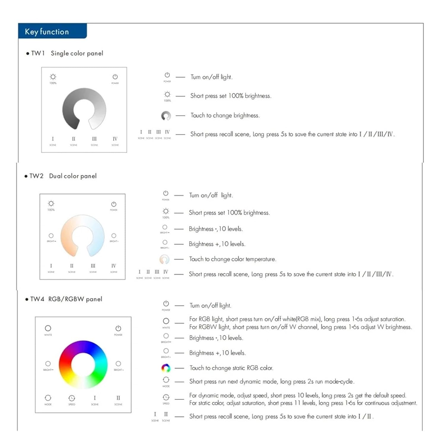 Outlet & Switch CombosWall-mounted touch screen remote control DC12V-24V CCT/RGB/RGBW/Dim dimmer switch for LED RGB light stripsnotes:1. TW1 TW2 TW3 TW4 TW5 are zone 1 and only control one controller.2. TW1-4 TW2-4 TW3-4 TW4-4 TW5-4 are 4 areas and can control 4 controllersFeatures: Certification: CEMaterial: ABSmaximum. Load power: 360WOrigin: Mainland ChinaProduct Type: DimmerType: wall-mounted touch screenWorking voltage: 3VOutput signal: 2.4G Remote control distance: 30MFeatures: Need to be used with switch